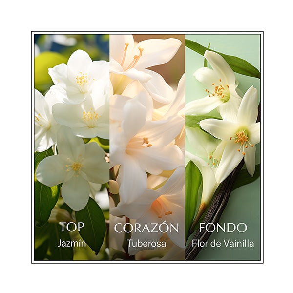 Elaborada con cuidado, esta creación combina el dulzor del jazmín, la frescura de las hojas verdes, la intensidad del nardo y suaves matices de almizcle, dando como resultado un perfume magnético y envolvente.