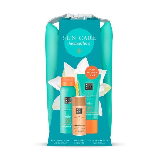 El set incluye una crema facial con filtro solar SPF 30, una loción solar en espray SPF 30 y un aceite corporal iluminador que aporta un brillo dorado y uniforme. Todo ello presentado en un práctico neceser impermeable.