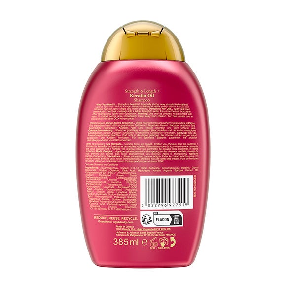 Este champú de OGX refuerza cada hebra capilar para prevenir el daño y las puntas abiertas, dejando el cabello más suave y con una luminosidad natural.