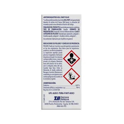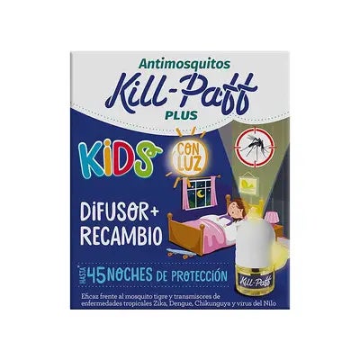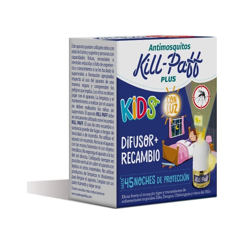 Difusor con luz antimiedo para los más pequeños. El insecticida eléctrico líquido antimosquitos Kill Paff no tiene olor, es eficaz frente al mosquito tigre y transmisores de enfermedades tropicales: Zika, Dengue, Chikunguya.