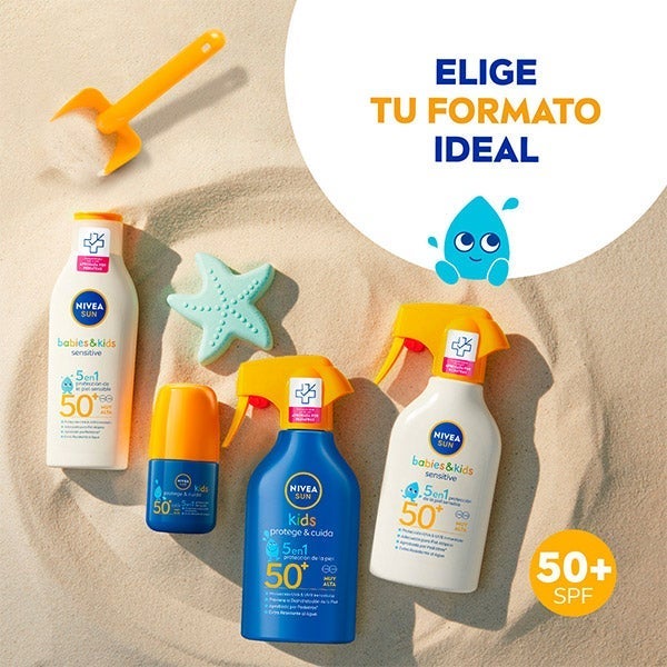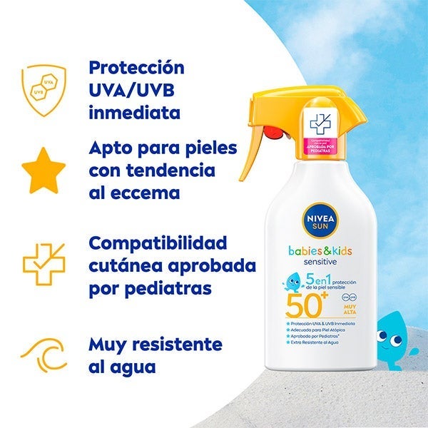 NIVEA SUN Babies & Kids Sensitive Spray Solar FP50+ ofrece una defensa inmediata y muy eficaz frente a los rayos UVA y UVB, ayudando a evitar las quemaduras solares y los daños cutáneos duraderos, además de disminuir la probabilidad de reacciones solares. Su fórmula, enriquecida con camomila orgánica y sin fragancia, ha sido creada especialmente para bebés y niños con piel sensible. Es extra resistente al agua y apta para piel atópica o con tendencia al eczema. Compatibilidad con la piel comprobada por pediatras.
