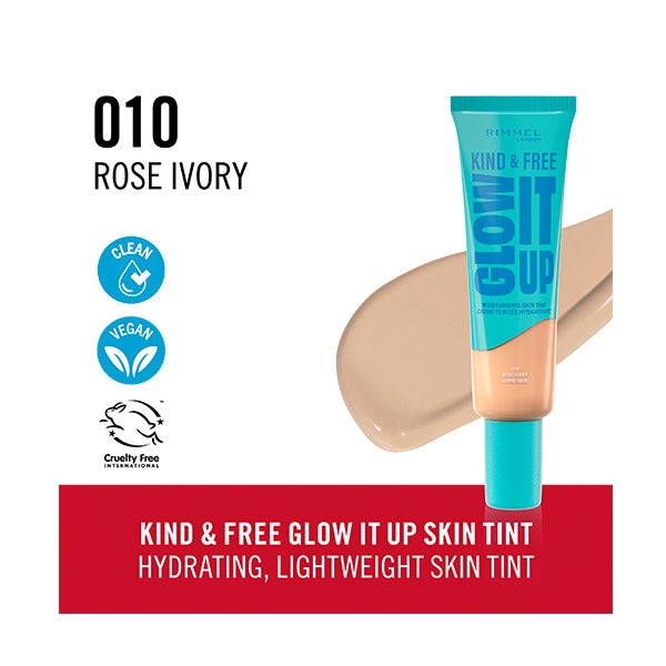 Nuestra primera colección de maquillaje clean que lo tiene todo. 100% vegana y comprometida con el bienestar animal y el cuidado del planeta. Sin fragancias, aceites minerales ni componentes de origen animal. El NUEVO Kind & Free™ GLOW IT UP es una base liviana e hidratante que aporta confort a la piel sensible, ofreciendo un efecto glow durante toda la jornada. Su fórmula, elaborada con ingredientes veganos y cruelty free, cuida de ti y del medioambiente.