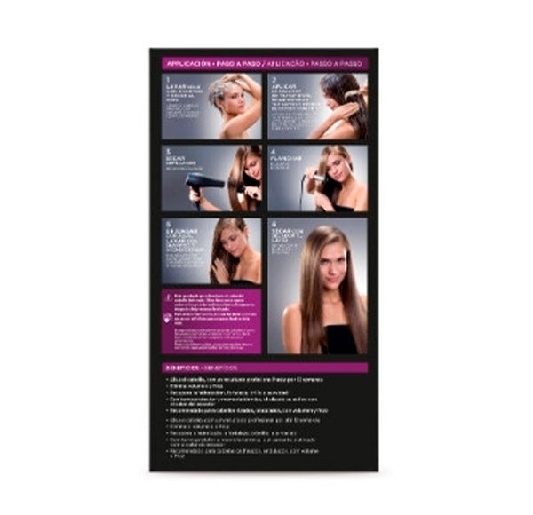 Seca el cabello utilizando secador y cepillo plano en dirección descendente, evitando realizar brushing para no retirar el producto, hasta dejarlo completamente seco.