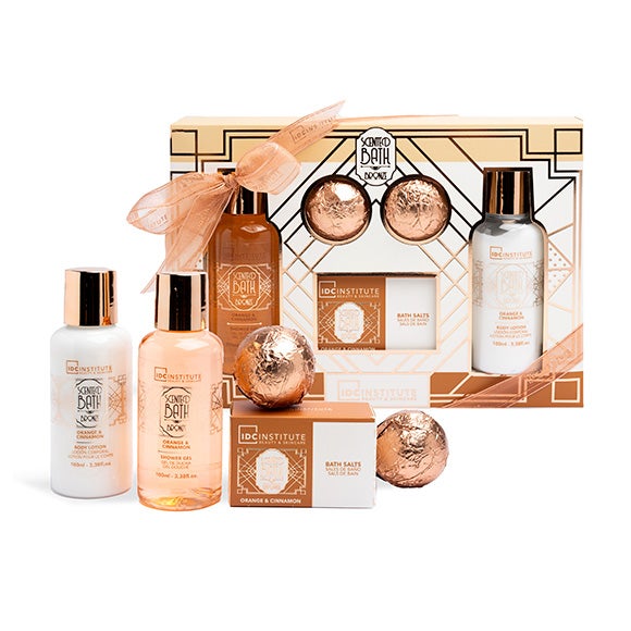 Este set de baño reúne todo lo que necesitas para crear una experiencia de spa sin salir de casa. Incluye un gel de ducha, una loción hidratante, sales relajantes y dos bombas efervescentes, todas con un encantador y cálido perfume de naranja y canela.