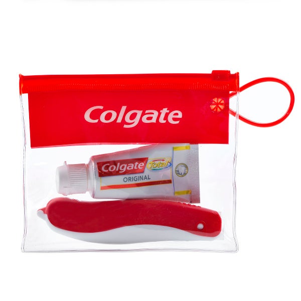 Colgate Kit Portátil combina un cepillo dental de viaje con cerdas suaves y una pasta dental de 20 ml, ideal para mantener la higiene bucal incluso cuando estás fuera de casa. El cepillo se pliega junto al dentífrico dentro de un estuche funcional. La tapa cubre el cabezal del cepillo plegado para proteger y conservar las cerdas limpias y secas.