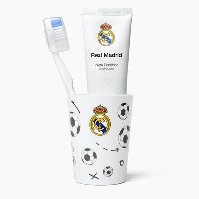 Convierte la rutina dental en un momento divertido con el Super Kit de Cuidado Dental Infantil del Real Madrid. Incluye cepillo de dientes, pasta dental, vaso y un práctico neceser, motivando a los más