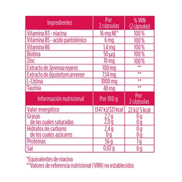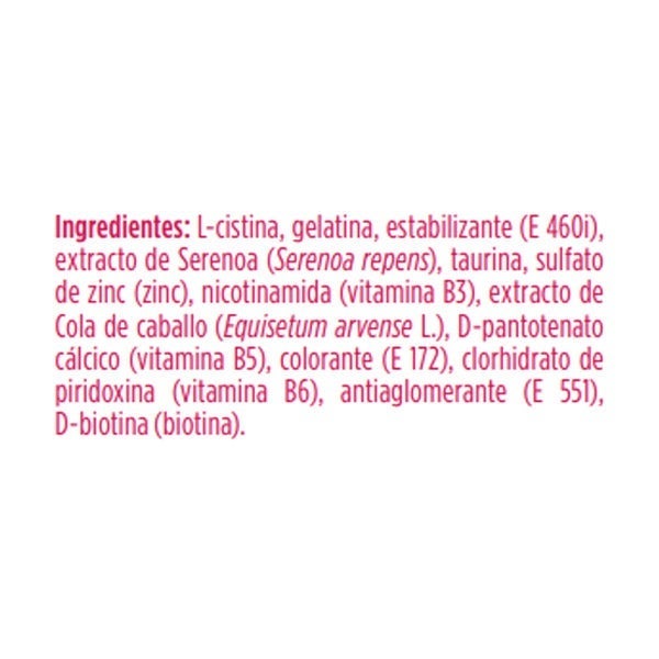 L-cistina, gelatina, estabilizante (E 460i), extracto de Serenoa (Serenoa repens), taurina, sulfato de Zinc (Zinc), nicotinamida (vitamina B3), Extracto de Cola de Caballo (Equisetum arvense L.), D-pantotenato cálcico (vitamina B5), colorante (E 172), clorhidrato de piridoxina (vitamina B6), antiaglomerante (E 551), D-biotina (biotina).