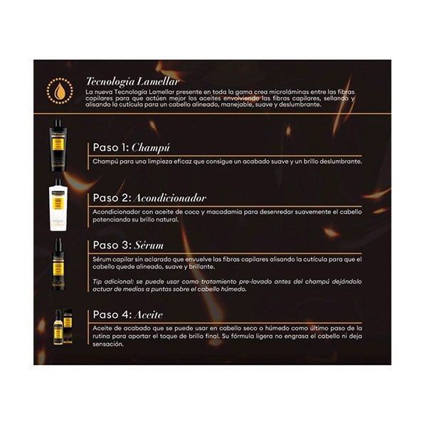 El set incluye un champú Lamellar Shine 400ml, un acondicionador Lamellar Shine 400ml, el sérum Lamellar Shine y el aceite Lamellar Shine 75ml, para lograr un estilo con acabado de salón y Brillo Ultra Gloss. Dale nueva vida a tu cabello con la rutina Lamellar Shine. Gracias a la Tecnología Lamellar Shine, las fibras capilares se envuelven para corregir, suavizar y alinear, consiguiendo un resultado de luminosidad intensa. Esta rutina incluye un champú que limpia suavemente y sin apelmazar, un acondicionador que aporta nutrición, hidratación y desenreda, ofreciendo un brillo natural; un sérum en textura crema sin aclarado, que hidrata mientras recubre las fibras capilares para conseguir mayor suavidad y alineamiento. Se recomienda aplicarlo después del acondicionador, tras eliminar el exceso de agua, extendiendo una pequeña cantidad desde medios hasta puntas sin enjuagar. El paso final para un brillo impresionante es el aceite capilar de acabado, que sella la cutícula y aporta un toque final luminoso. Su textura ligera no apelmaza ni engrasa el cabello.