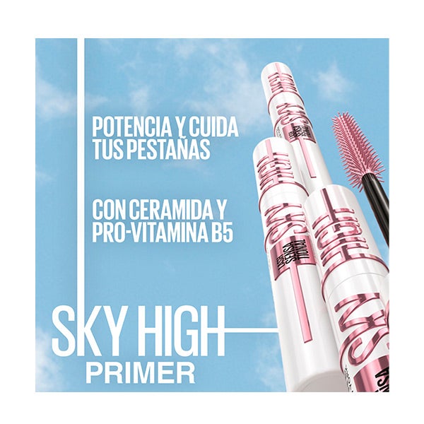 Pestañas visiblemente más largas y protegidas gracias al Primer con color Lash Sensational Sky High, enriquecido con Ceramida y Pro-Vitamina B5, para dar a tu mirada una elevación inigualable.