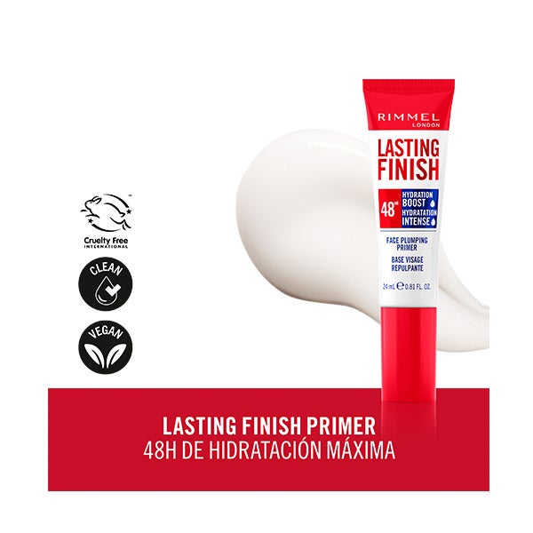 Lasting Finish Primer 48H Hydration Boost de Rimmel London incorpora biopeptidos que aportan una hidratación profunda hasta por 48 horas. Su acción ayuda a rellenar la piel y a suavizar progresivamente las líneas de expresión. La fórmula ligera y refrescante mejora de inmediato el aspecto apagado, dejando un acabado luminoso y natural.