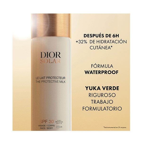 De textura ligera y refrescante, la leche Dior Solar Leche Protectora para Rostro y Cuerpo SPF 30 ofrece una agradable sensación en la piel sin dejar residuo graso. Su formato en bruma resulta práctico para una aplicación uniforme sobre toda la superficie cutánea.