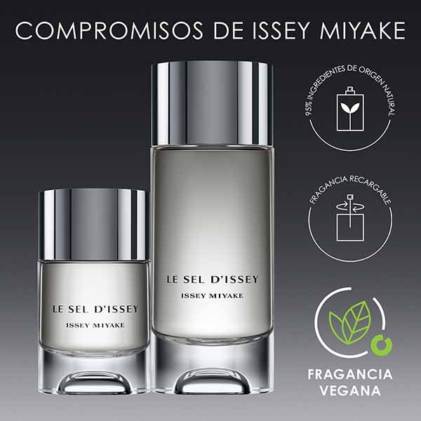 Le Sel d’Issey Eau de Parfum está elaborado con un 94% de ingredientes de origen natural, incluyendo alcohol francés totalmente natural, y cuenta con certificación vegana.