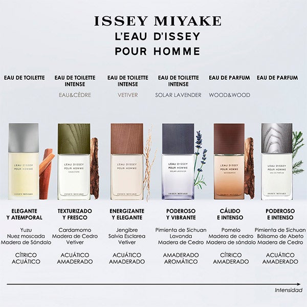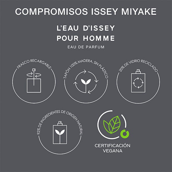 L'Eau d'Issey pour Homme Eau de parfum es una creación vegana con un 92% de ingredientes de origen natural. La madera de cedro reciclada tiene procedencia 100% natural, al igual que el bálsamo de abeto y la pimienta de Sichuan, ambos obtenidos de forma responsable.