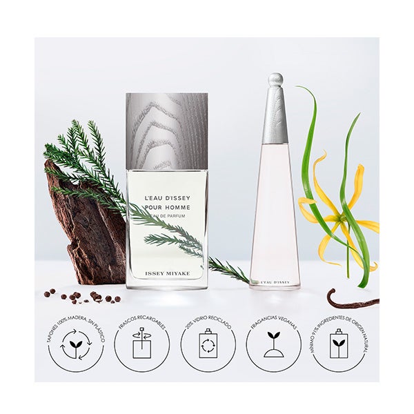 *Comparado con el tapón del frasco de 100 ml de L'Eau d'Issey EDT: datos basados en un análisis ambiental específico centrado en el envase, considerando la variación del lugar de producción, el rediseño del frasco, la elección de los materiales y el peso de estos únicamente.