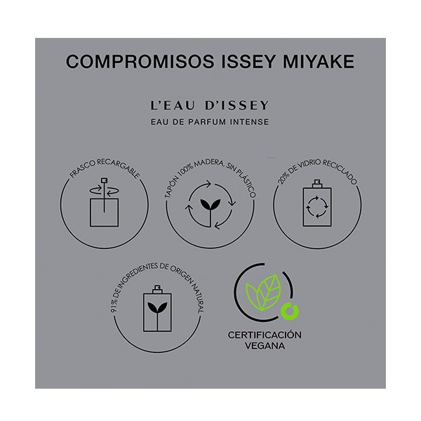 Compuesto con un 91% de ingredientes de origen natural, entre ellos una vainilla 100% natural. El ylang-ylang, igualmente 100% natural, proviene de las Comoras y se obtiene de manera responsable y con certificación. L'Eau d'Issey Eau de parfum intense cuenta con certificación vegana.