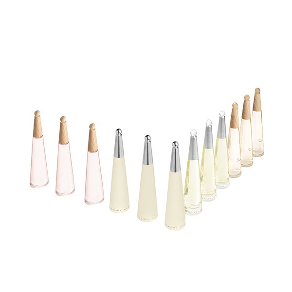 El frasco de L'Eau d'Issey Pivoine se elabora con un 20% de vidrio reciclado y está coronado por un tapón sin plástico, fabricado en madera de bosques gestionados de manera responsable.