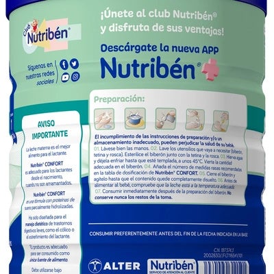 LECHE NUTRIBEN CONFORT 800G está formulada para el soporte dietético de molestias digestivas leves, como el estreñimiento o los cólicos en los bebés.