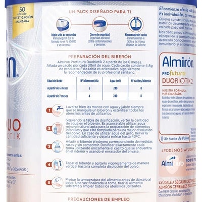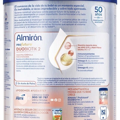Almirón Profutura Duobiotik 2 es una leche de continuación especialmente diseñada para bebés a partir de los 6 meses de edad. Esta fórmula avanzada está cuidadosamente desarrollada para complementar la alimentación de tu bebé en una etapa clave de su crecimiento. Gracias a su innovadora combinación de ingredientes, proporciona los nutrientes esenciales que apoyan el desarrollo del sistema inmunológico, el cerebro y los tejidos nerviosos.