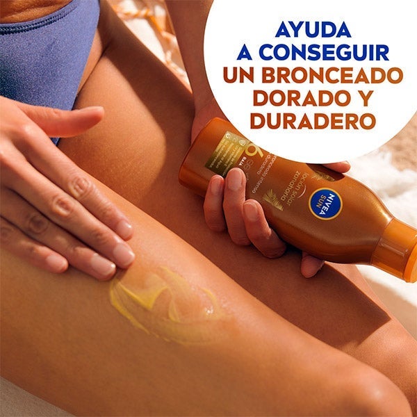 NIVEA SUN Loción Solar Zanahoria FP 6 brinda defensa frente a la radiación UV y favorece que la piel obtenga un tono bronceado más profundo y duradero sin necesidad de autobronceador. Su composición con Extracto de Caroteno y Vitamina E es resistente al agua y tiene una textura ligera que facilita la aplicación y una rápida absorción.