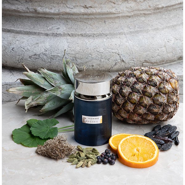 Pertenece a una familia olfativa con una nota oriental que aporta profundidad, presencia y carácter propio. De línea refinada, su frasco azul intenso con delicadas estrías luce una placa metálica grabada con el sello Rochas en la base, y su tapón plateado realza el atractivo de este elegante recipiente que guarda la esencia.