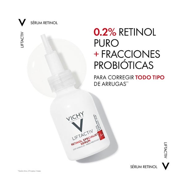 Liftactiv Sérum Retinol Specialist es el primer tratamiento de Laboratorios Vichy formulado especialmente para reducir las líneas de expresión y las arrugas marcadas, al mismo tiempo que mejora la uniformidad del tono y refuerza la barrera cutánea.