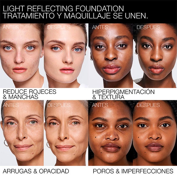 Su fórmula es compatible con todo tipo de piel, incluso la sensible. No contiene aceites minerales, siliconas, fragancias ni parabenos. Disponible en una extensa paleta de 36 tonos.