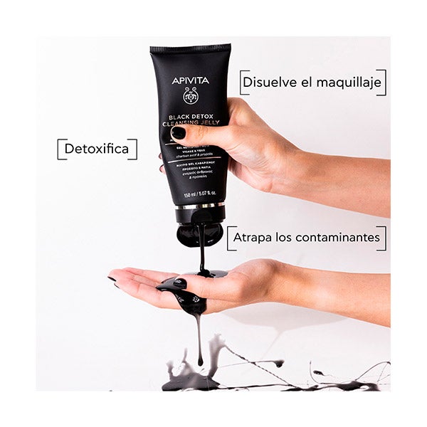 Gel limpiador negro detox formulado con carbón activo y propóleo que purifica rostro y ojos en profundidad sin causar sequedad.