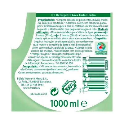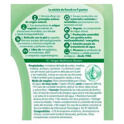 Froggy ecológico Hogar Multiusos pH-neutro, superficies delicadas. Limpieza delicada de suelos, muebles de cocina y baño, muebles de madera, baldosas y sanitarios. La fórmula con tensioactivos de origen vegetal rinde mucho y gracias a su pH-neutro protege las manos y los materiales delicados (incluso en caso de uso frecuente). Indicado también para el lavado a mano de lencería o para la limpieza de las manos. Dermatológicamente testado.