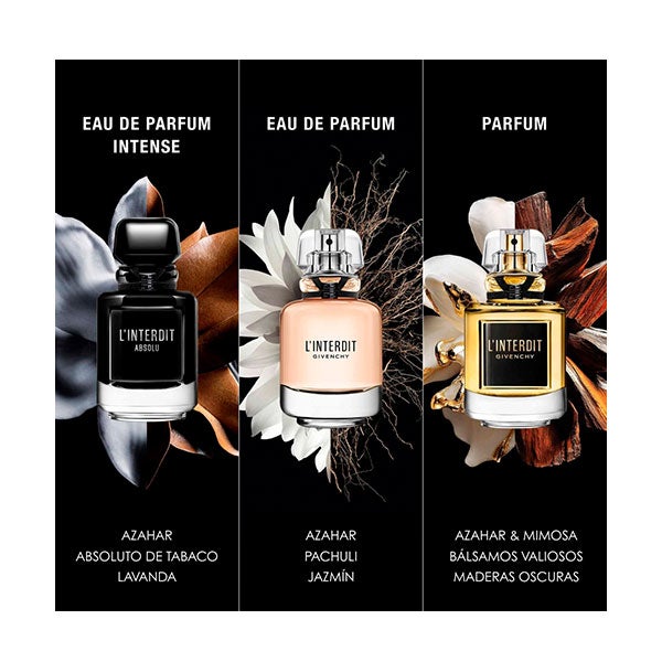 L'Interdit Parfum desvela un perfume floral amaderado con matices balsámicos y seductores. La suavidad de la esencia de almendra amarga se funde con el clásico bouquet blanco de L'Interdit, donde flor de azahar, nardo y jazmín se entrelazan con las notas aterciopeladas y luminosas del absoluto de mimosa. El equilibrio entre vetiver y pachulí aporta un toque cálido, sensual y de elegante profundidad.