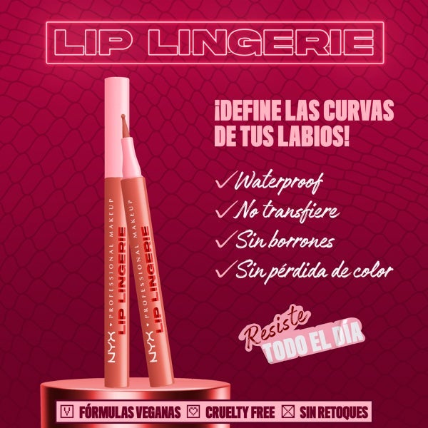 Perfila, define y resalta tus labios con NYX Professional Makeup Lip Lingerie Stain, el delineador líquido que ofrece máxima precisión y larga duración. Su fórmula vegana, ligera y resistente al agua se aplica con suavidad, proporcionando un acabado satinado y confortable durante todo el día. Gracias a su aplicador de punta de fieltro, podrás contornear, delinear o rellenar los labios con total exactitud, evitando manchas o difuminados. Su textura sedosa se adhiere uniformemente, manteniendo el color intacto sin transferirse ni perder intensidad. Luce unos labios definidos con un toque elegante y persistente, perfectos para cualquier momento.