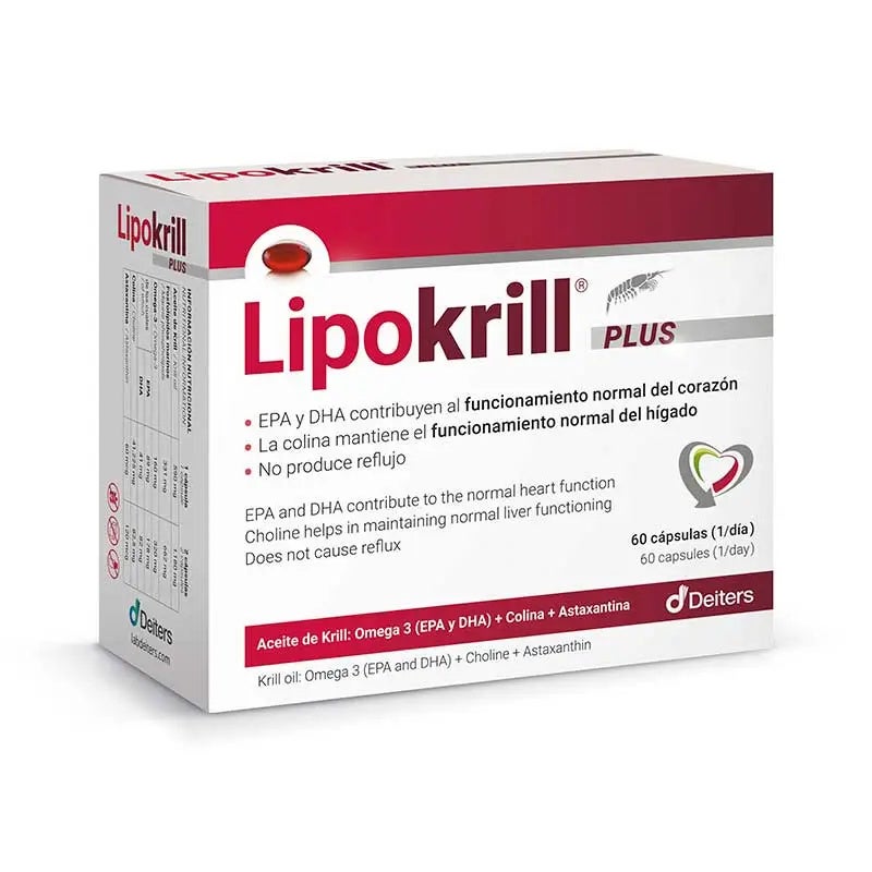 Contiene exclusivamente aceite de Krill Antártico al 100%, con una concentración elevada de fosfolípidos de Omega-3 eicosapentaenoico (EPA), docosahexaenoico (DHA) y colina, de fácil absorción. Además, incorpora Astaxantina, un antioxidante natural propio del aceite de Krill. Cada cápsula de Lipokrill® Plus suministra 590 mg de Aceite de Krill concentrado.