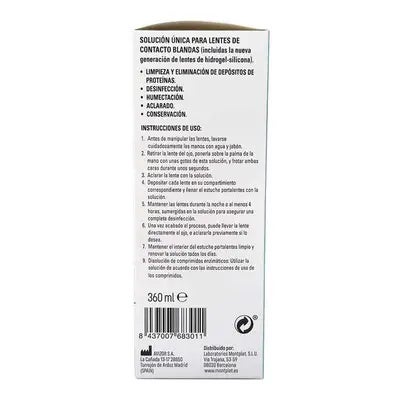 Montplet Líquido de lentillas 360 ml es la solución ideal para el cuidado de tus lentes de contacto blandas y desechables. Este líquido proporciona una limpieza efectiva, desinfección y mantenimiento adecuado para asegurar que tus lentes estén siempre en óptimas condiciones.