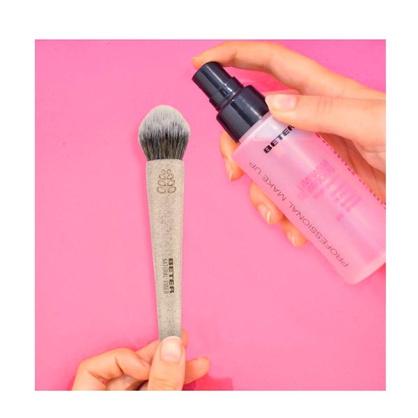 Pulveriza 2 o 3 veces directamente sobre las cerdas de la brocha o pincel y limpia con movimientos suaves sobre un papel absorbente.