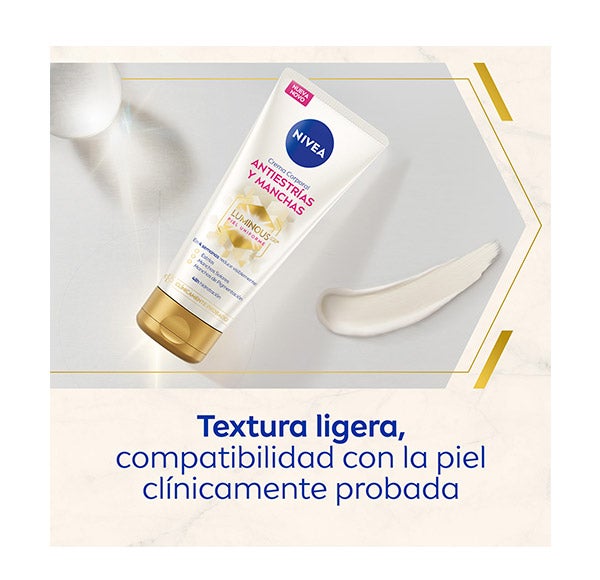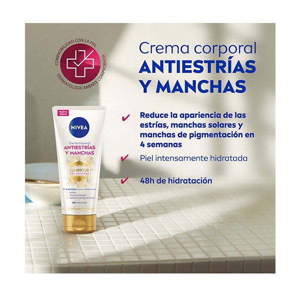 La crema corporal Anti-Estrías y Manchas Nivea Luminous 630 Piel Uniforme ayuda a mejorar visiblemente el aspecto de la piel en 4 semanas, reduciendo de forma perceptible: