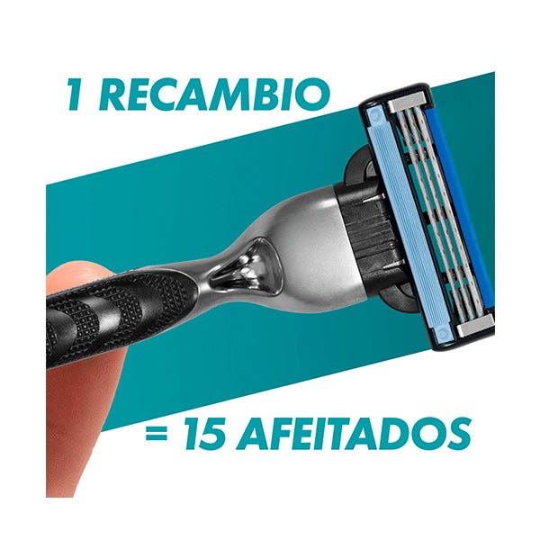 Maquinilla de Afeitar de 3 hojas. Fabricada con hojas de acero de corte de alta precisión que ofrecen hasta 15 usos por recambio.