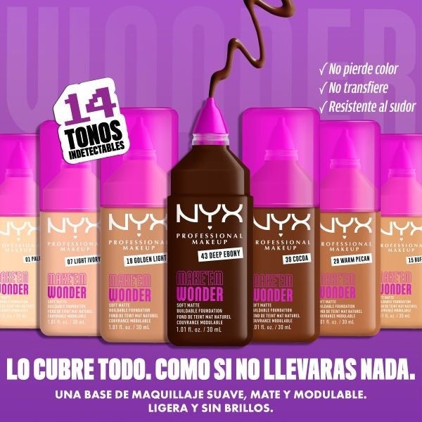 Experimenta la nueva base de maquillaje Make ’Em Wonder de NYX Professional Makeup, una fusión ideal entre cosmético y cuidado facial. Su fórmula líquida vegana ofrece una cobertura adaptable con un acabado mate y natural, logrando un aspecto uniforme sin sensación pesada.