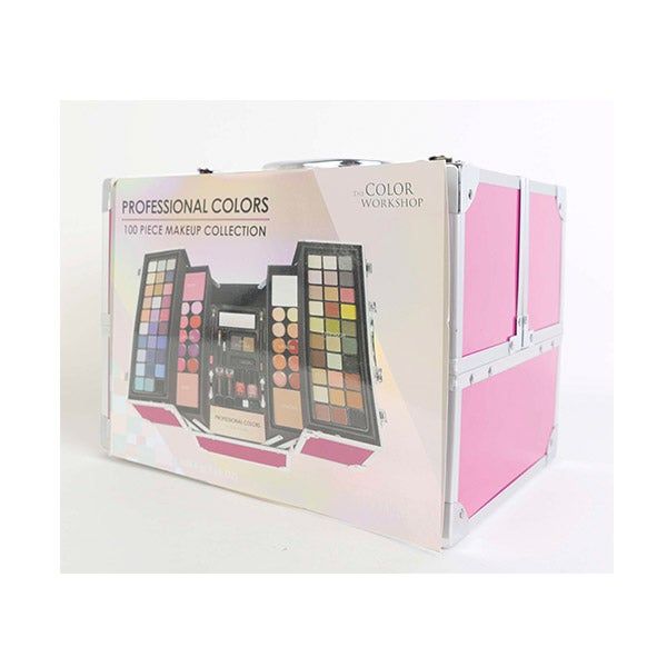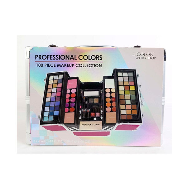 Un completo set profesional que contiene: un maletín color plateado, 60 tonalidades de sombras para ojos, 20 brillos labiales, 4 variedades de polvos compactos, 2 pigmentos para cejas, 2 barras de labios, 2 esmaltes de uñas, una máscara para pestañas, 2 delineadores, además de aplicadores y brochas.