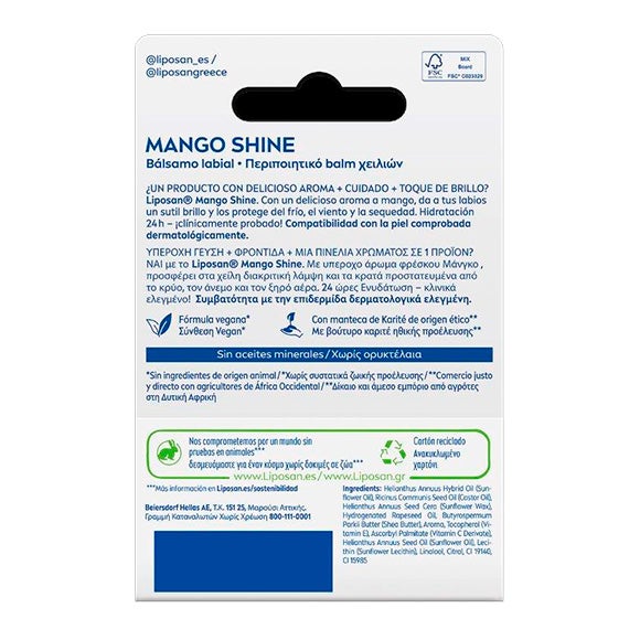 ¿BUSCAS UN PRODUCTO QUE AÚNE AROMA IRRESISTIBLE, CUIDADO Y LIGERO BRILLO? Liposan® Mango Shine ofrece un delicioso perfume a mango, aporta un brillo natural y ayuda a proteger los labios frente al frío, el viento y la sequedad. Proporciona hidratación durante 24 horas – ¡eficacia clínicamente comprobada! Su tolerancia cutánea ha sido verificada dermatológicamente. Utilízalo de manera continua para mantener los labios suaves e hidratados. No ingerir. Guardar en un lugar fresco y seco.