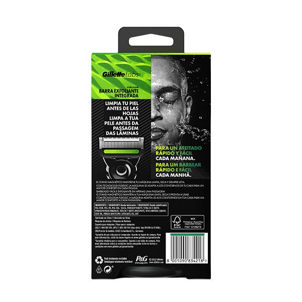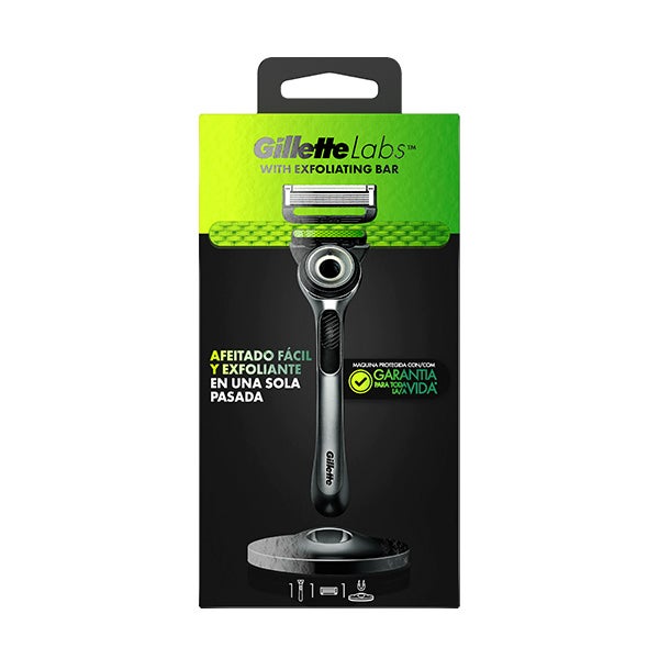 GILLETTE LABS con barra exfoliante de Gillette es la primera maquinilla de afeitar del mundo que incorpora una tecnología exfoliante directamente en el mango, haciendo que el afeitado sea tan sencillo y veloz como lavarte el rostro.