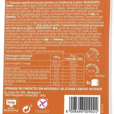 Por suerte, existe un amplio surtido de pasteles y galletas de Schär para todos los gustos, para que puedas disfrutar sin preocupaciones de momentos agradables. Además proporcionan el aporte energético adecuado. ¡El clásico bizcocho de chocolate, esponjoso y suave como el que haces en casa! Una fina pasta con intenso sabor a cacao y una suave nota de vainilla. Alimento apto para dietas. No contiene ni gluten, ni trigo ni lactosa.