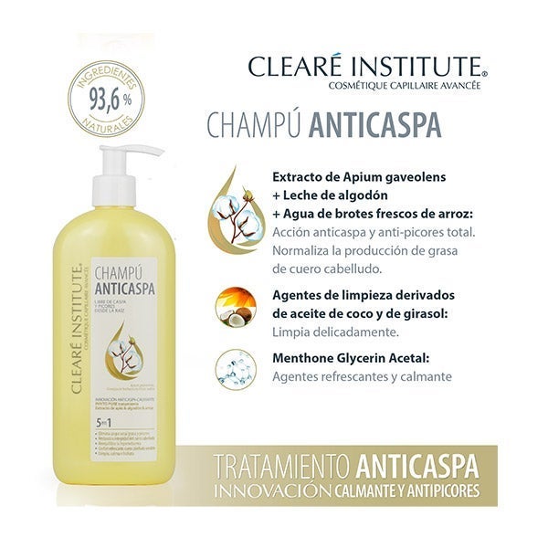 Clearé Institute Acondicionador Mascarilla Anticaspa 150ml está formulado con un 97% de componentes de origen natural, ayuda a eliminar la caspa y previene su aparición mientras nutre, suaviza y ofrece un acondicionamiento profundo al cabello.