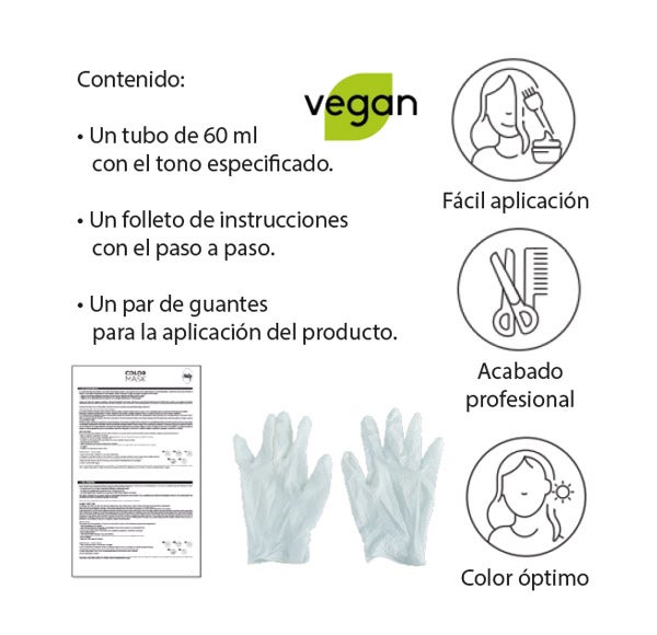 Manejo cuidadoso: durante la aplicación, usa los guantes incluidos y una toalla sobre los hombros. Manipula con precaución el cabello húmedo tras la aplicación para no transferir pigmento.