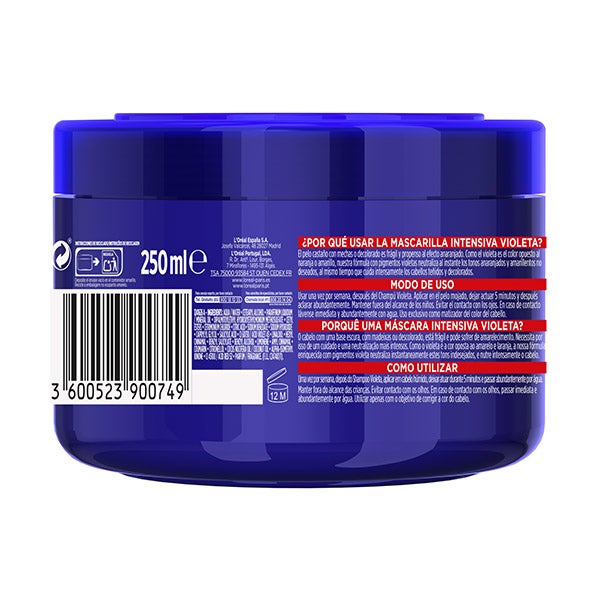 Neutraliza los reflejos amarillos y cobrizos no deseados mediante su fórmula enriquecida con pigmentos violetas, aportando además una nutrición profunda al cabello.