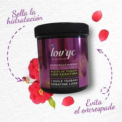 La mascarilla capilar LOV’YC LISO KERATINA CON ACEITE DE TSUBAKI, sella la hidratación para prevenir el encrespamiento, para lucir un cabello brillante y sedoso.