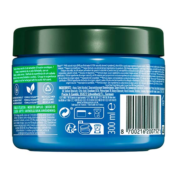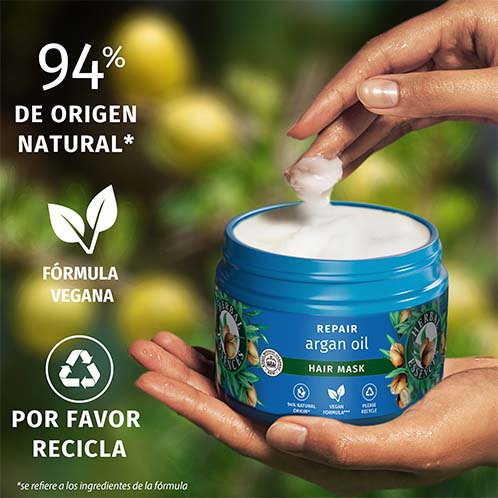 Herbal Essences Mascarilla Reparadora con Aceite de Argán nutre y restaura el cabello dañado, dejando una sensación de suavidad y luminosidad. Su fragancia exótica y fresca aporta energía y bienestar. Gracias a la fusión de extractos botánicos y el valioso Aceite de Argán, esta fórmula vegana ofrece una hidratación profunda para el cabello frágil. Desde la primera aplicación, fortalece y repara de manera natural. Elaborada con ingredientes cuidadosamente seleccionados de origen natural, lleva la esencia de la naturaleza directamente a tu rutina de cuidado capilar.
