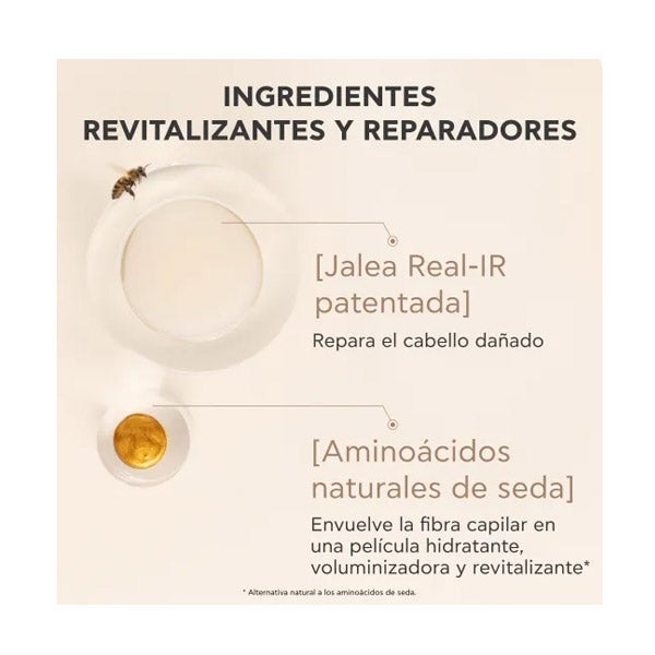 Royal Elixir Mascarilla acondicionadora con efecto volumen está formulada con Jalea Real-IR patentada, que restaura los espacios de queratina, sella la cutícula y disminuye la porosidad del cabello. Aporta una reparación total del cabello dañado*. Junto a un 1% de aminoácidos naturales de seda**, crea una capa de hidratación que envuelve la fibra capilar, aportando cuerpo, suavidad y vitalidad.