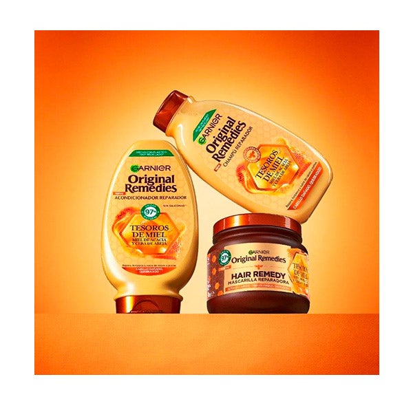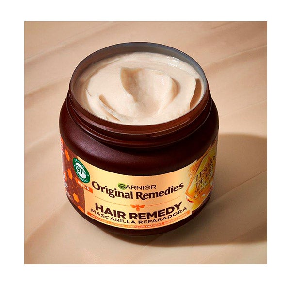 Garnier Original Remedies Mascarilla reparadora Hair Remedy Tesoros de Miel con miel de acacia y cera de abejas, ideal para cabello débil y quebradizo. Proporciona una nutrición intensa y una reparación profunda, dejando el pelo con un aspecto naturalmente más saludable.