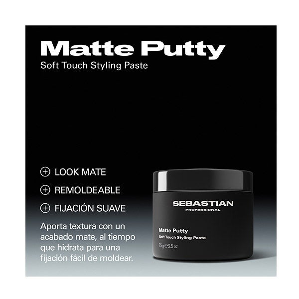 Sebastian Professional Matte Putty es una pasta de peinado que ofrece textura con un efecto mate, mientras mantiene el cabello hidratado para una fijación moldeable. Su textura permite remodelar el estilo con facilidad, aportando una sujeción suave y elástica que se adapta a cualquier tipo o largo de cabello. Ideal para redefinir rizos, dar forma o destacar detalles durante todo el día.