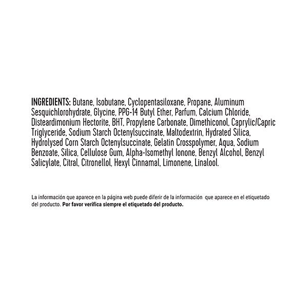 INGREDIENTS: Butane, Isobutane, Cyclopentasiloxane, Propane, Aluminum Sesquichlorohydrate, Glycine, PPG-14 Butyl Ether, Parfum, Calcium Chloride, Disteardimonium Hectorite, BHT, Propylene Carbonate, Dimethiconol, Caprylic/Capric Triglyceride, Sodium Starch Octenylsuccinate, Maltodextrin, Hydrated Silica, Hydrolysed Corn Starch Octenylsuccinate, Gelatin Crosspolymer, Aqua, Sodium Benzoate, Silica, Cellulose Gum, Alpha-Isomethyl Ionone, Benzyl Alcohol, Benzyl Salicylate, Citral, Citronellol, Hexyl Cinnamal, Limonene, Linalool.