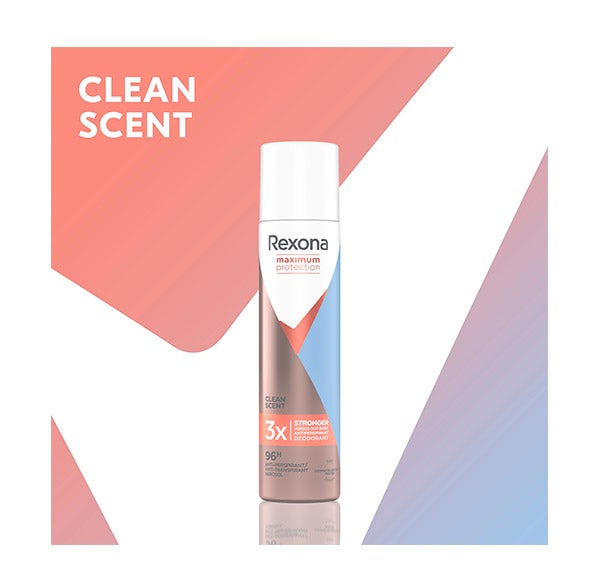 Desodorante Antitranspirante Rexona para mujer, Maximum Protection Clean Scent 100ml en práctico formato aerosol.